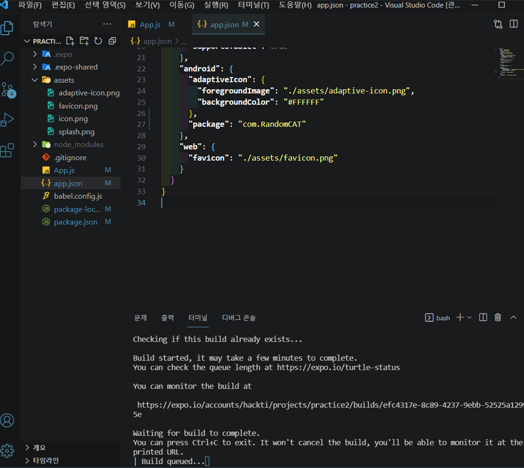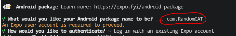 expo로 빌드할때는 안드로이드 패키지 이름을 지정해줘야한다. App.json에서 지정해줄수도 있지만, 그냥 빌드 명령어를 돌려도 expo가 자동으로 빠뜨린 부분 없는지 스캔해주고, 있다면 이렇게 터미널창에서 알려주기 때문에 정말 편리하다.
