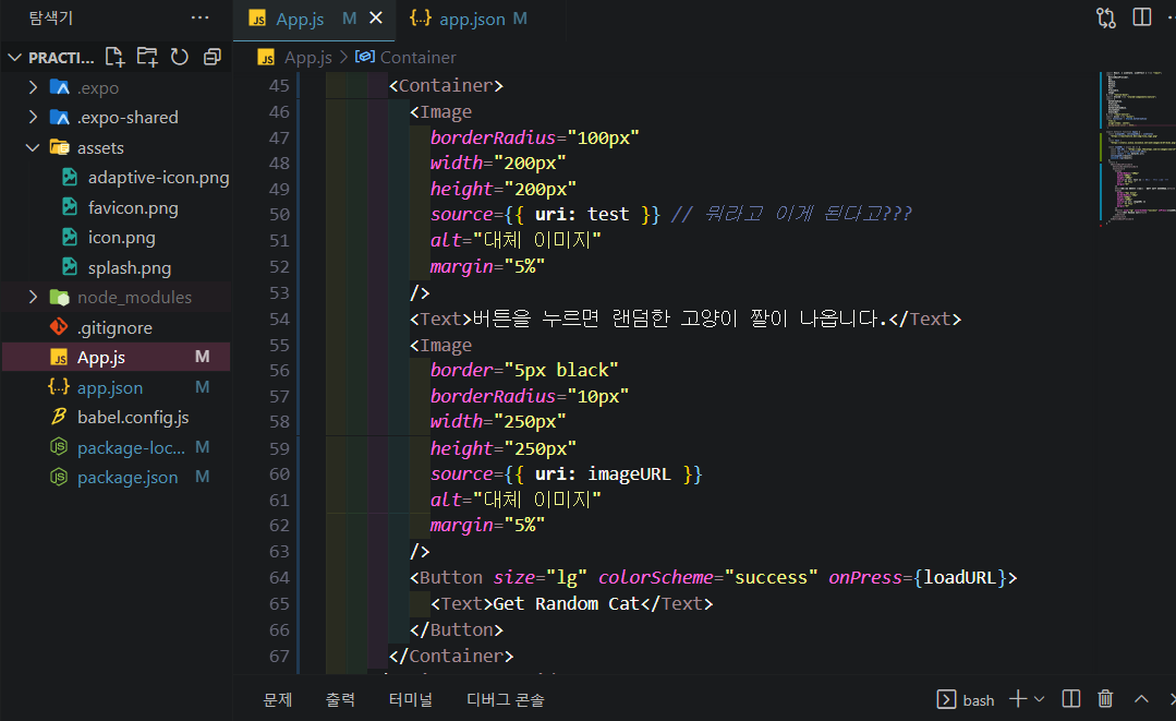 Styled component에 변수를 박아넣어서 만들 수 있다면 해결될거 같은데...내가 집어넣는 코드마다 에러를 뱉어내고 뻗어버리는 expo가 야속하기까지 했다. source ="uri : "~~~~" 꼴의 코드를 넣을 때마다 Image 컴포넌트에 source라는 속성이 없다고 하는건 도대체 뭘까....