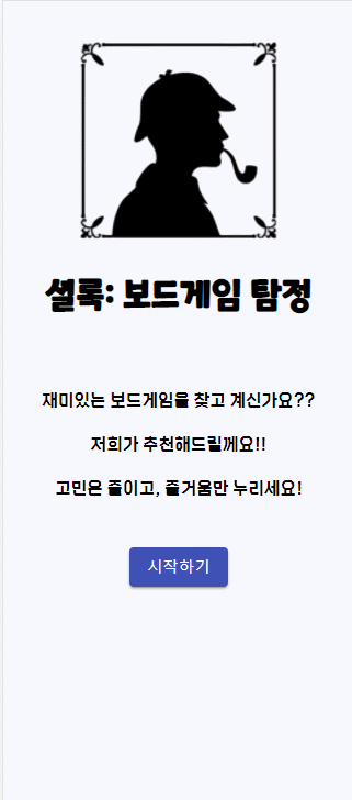 최적의 보드게임을 "찾아"준다는 느낌을 더 살리고 싶었기에, 탐정 "셜록 홈즈"의 이름을 따와, 현 상황에 딱 맞는 보드게임을 "찾아준다" 라는 느낌이 사용자에게 전달되도록 하였습니다.